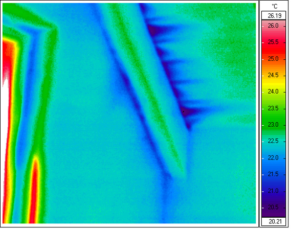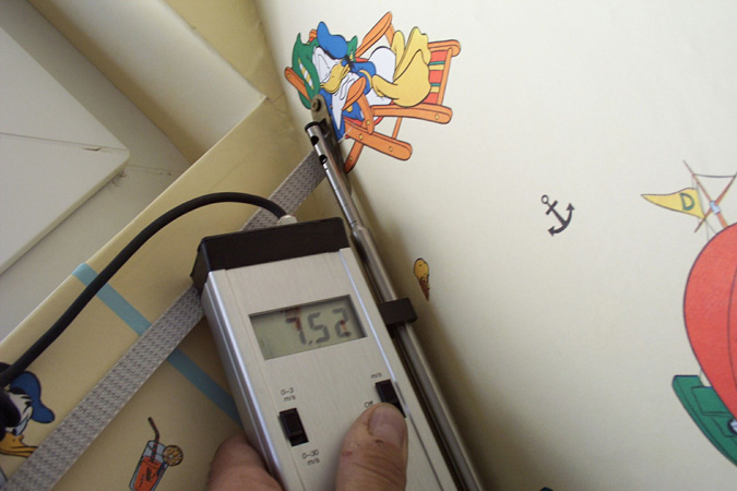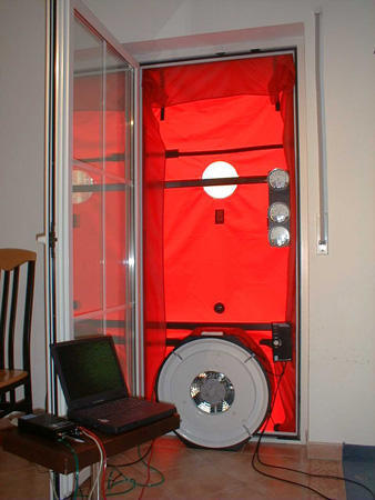 Durch den Einbau eines Gebläses in eine Außentüre wird ein Unter- bzw. Überdruck erzeugt, wodurch bestehende Wärmebrücken oder Dämmfehler alleine durch den Luftzug erkennbar werden. Oft sind Undichtigkeiten an Rollladenkasten, Dachgauben und Holzverschalungen für große Wärmeverluste verantwortlich. Diese Leckagen können mit der Hand, mit dem Windanemometer oder mit der Thermokamera aufgespürt werden.